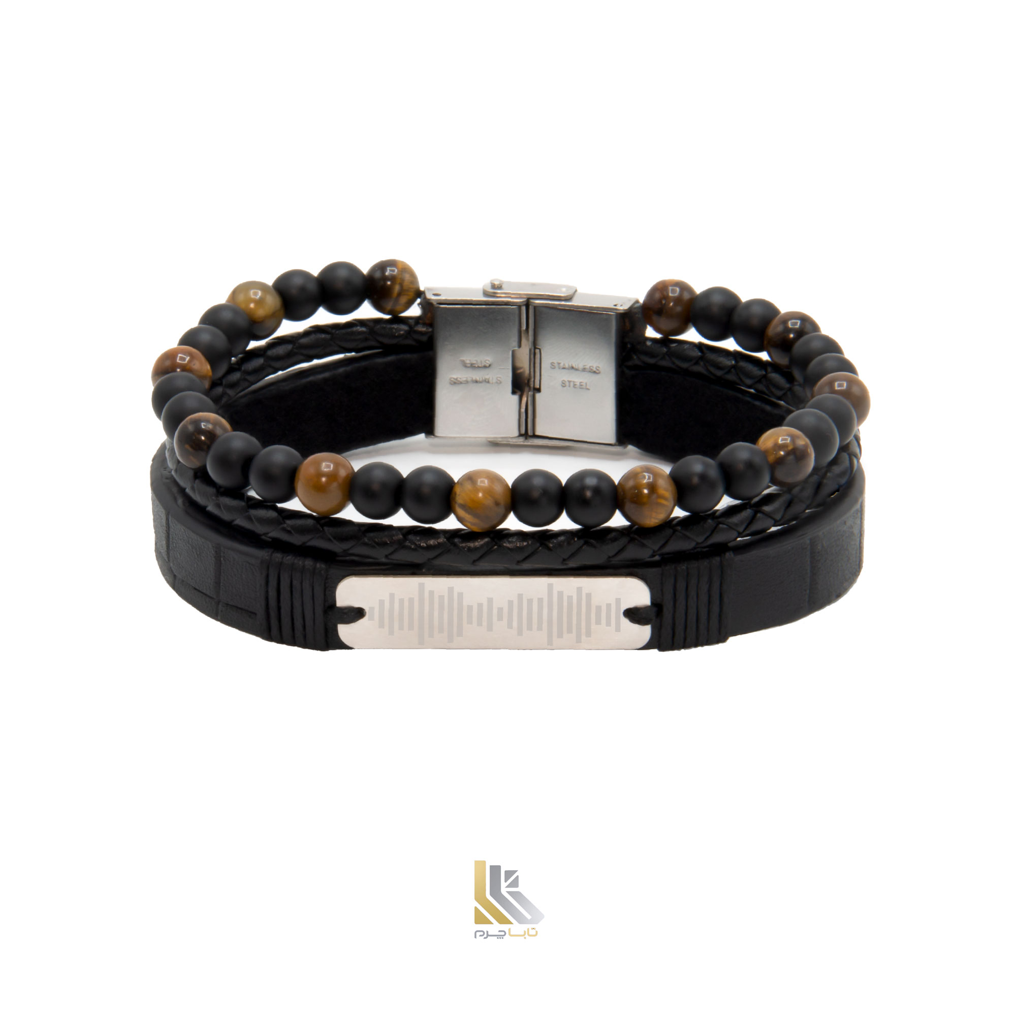 دستبند فرکانس صدا از چرم طبیعی و مهره رنگ قهوه ای تایگر و سنگ مشکی اونیکس و پلاک با فرکانس صدا تشکیل شده است. قفل دستبند از جنس استیل رنگ ثابت و دارای گارنتی ساخته شده است. در مورد پلاک دستبند باید به عرض شما برسانیم که این پلاک از جنس طلا و یا نقره به انتخاب شما می باشد.