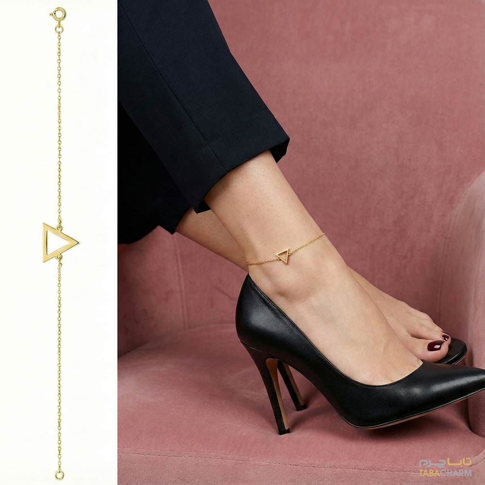 2. طراحی مثلث توخالی (Open Triangle Charm): این پلاک به صورت یک مثلث متساوی‌الاضلاع توخالی طراحی شده است. مثلثی که راس آن به سمت پایین باشد، در نمادشناسی کهن نماد “زنانگی و آب” است. این طراحی هندسی باعث می‌شود پابند روی پا بسیار سبک باشد و با هر نوع استایلی (از جین تا لباس شب) ست شود.