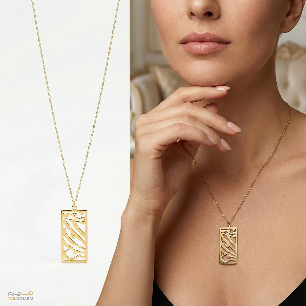 این پلاک تایپوگرافی با استفاده از زنجیر فلامینگو به گردن آویخته می‌شود. درخشش و بافت خاص زنجیر فلامینگو، مکمل پیچ و تاب‌های زیبای خط فارسی در این پلاک است.